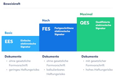 In den meisten geschäftlichen Fällen reicht die fortgeschrittene elektronische Signatur (FES) aus. Sie ist rechtlich gültig, bietet ein hohes Sicherheitsniveau und lässt sich zügig durchführen.