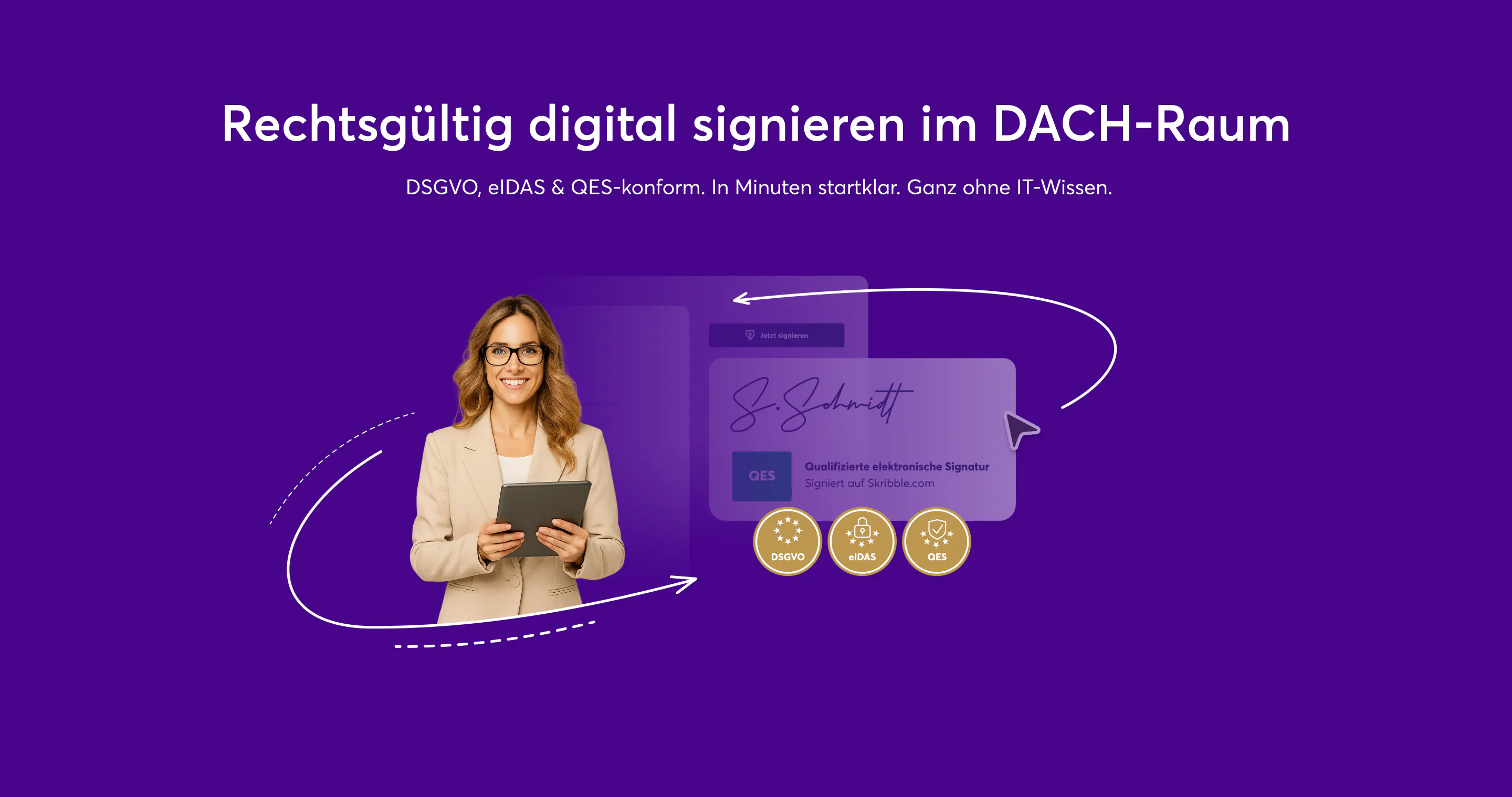 Rechtsgültig digital signieren im DACH-Raum. DSVG, ZertES & QES-konform. In Minuten startklar. Ganz ohne IT-Wissen.