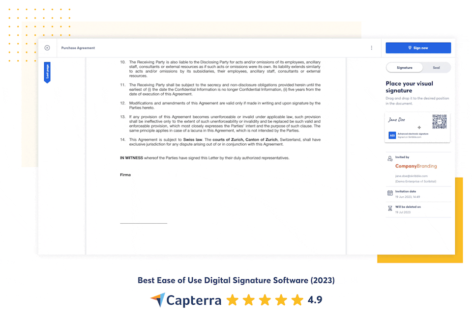 - Legality: eIDAS (EU), ESIGN (US), and ZertES (CH); QES available without extra third-party contracts.